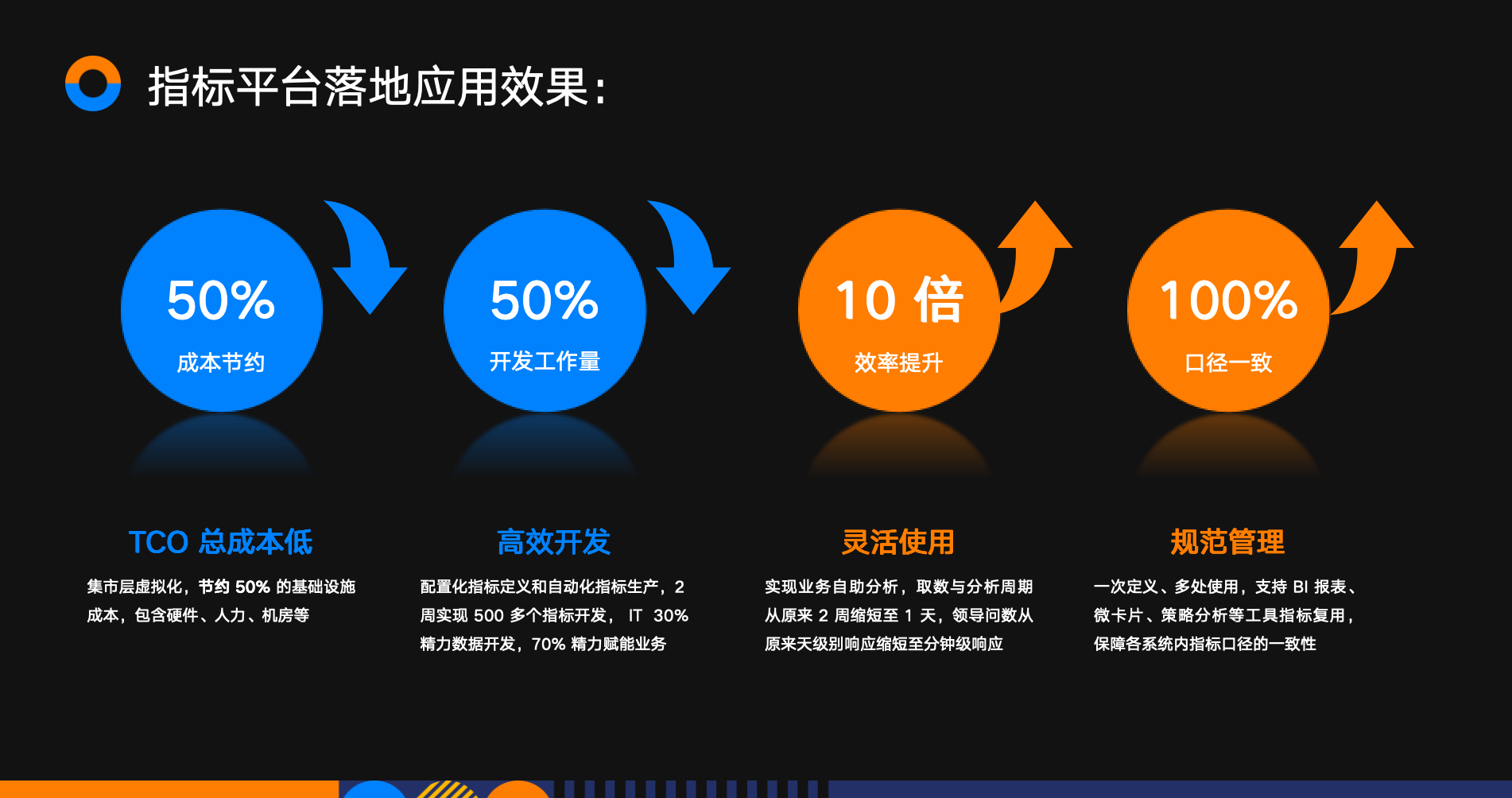 从数据表现来看,指标平台的应用效果显著,尤其在降低开发成本和实现规范管理方面成效突出,而规范的管理不仅提升了我们的运营水平,还能为各种应用的拓展和丰富提供支撑。