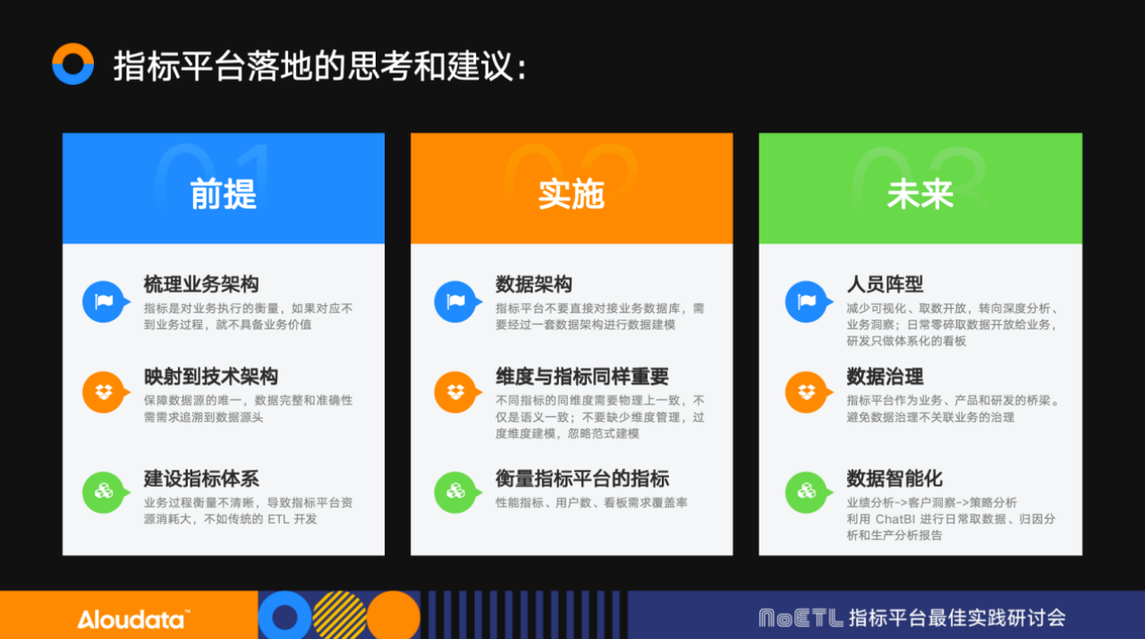 在实施过程中,则需要将指标平台融入数据架构,作为业务、产品和研发的桥梁,以确保数据治理与业务紧密结合。同时注重维度管理和指标平台的衡量标准,如性能、用户数、看板需求覆盖率等。