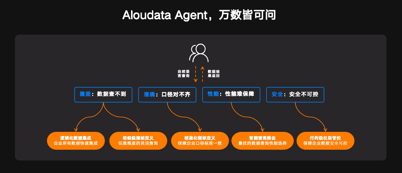基于此,Aloudata 将先进的 NoETL 数据工程技术与大模型能力融合,重磅推出 Aloudata Agent,一款面向企业数据分析场景的 AI 智能体应用,助企业实现「万数皆可问」。这一创新产品支持自然语言查询,通过逻辑化数据集成、明细级数据查询、标准化指标定义、智能查询路由、行列级权限管控,可帮助企业轻松搞定「数据查不到、口径对不齐、性能难保障、安全不可控」四大难题,实现企业所有数据的快速集成与安全可控,进而将企业 AI 应用创新所需的数据准备就绪。