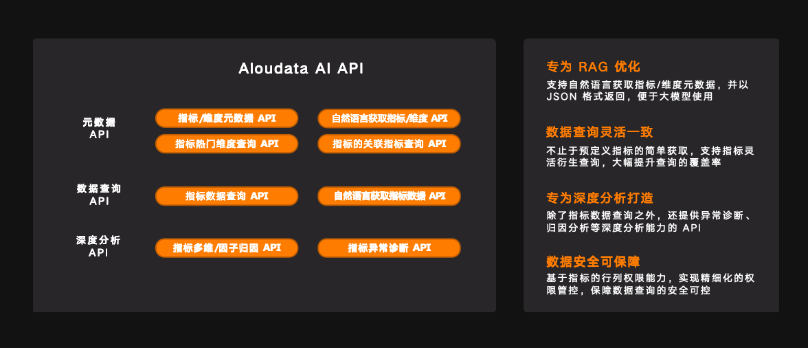 此外,Aloudata 还发布了专为 RAG(Retrieval-Augmented Generation)优化的 Aloudata AI API,可为企业提供元数据 API(包括指标/维度元数据 API、自然语言获取指标/维度 API、指标热门维度查询 API、指标的关联指标查询 API)、数据查询 API(包括指标数据查询 API、自然语言获取指标数据 API)、深度分析 API(包括指标多维/因子归因 API、指标异常诊断 API),极大便捷企业 AI 大模型用数需求,进一步加速 AI 应用创新。
