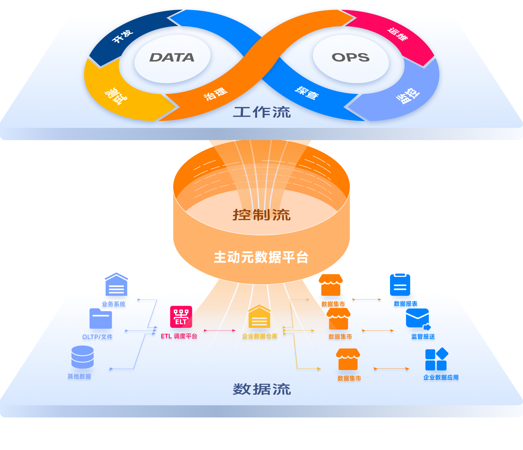 控制流:DataOps 的感知决策中心,通过实时采集、解析和分析各项元数据信息,驱动“工作流”和“数据流”的敏捷流转和持续迭代。