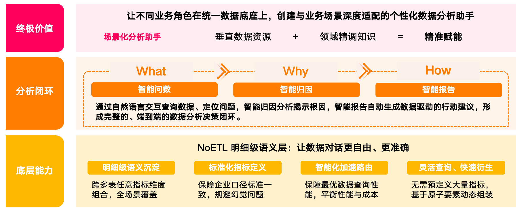 导致这些问题的原因在于,NL2SQL 和 NL2DSL2SQL 技术路径缺乏一个强大的数据底座,无法为上层 Agent 提供完整的数据覆盖、精准的数据语义、强大的查询性能、可靠的安全保障等能力支持。