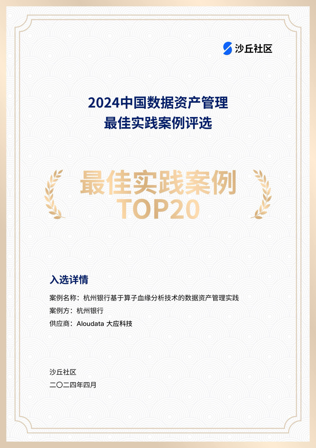 近日,数字化领域权威研究机构沙丘社区重磅发布「2024 中国数据资产管理最佳实践案例」Top20 榜单,凭借在数据管理领域的技术优势及领先的落地实践经验,Aloudata BIG 主动元数据平台携手杭州银行打造的《基于算子血缘分析技术的数据资产管理实践》 荣登榜单。