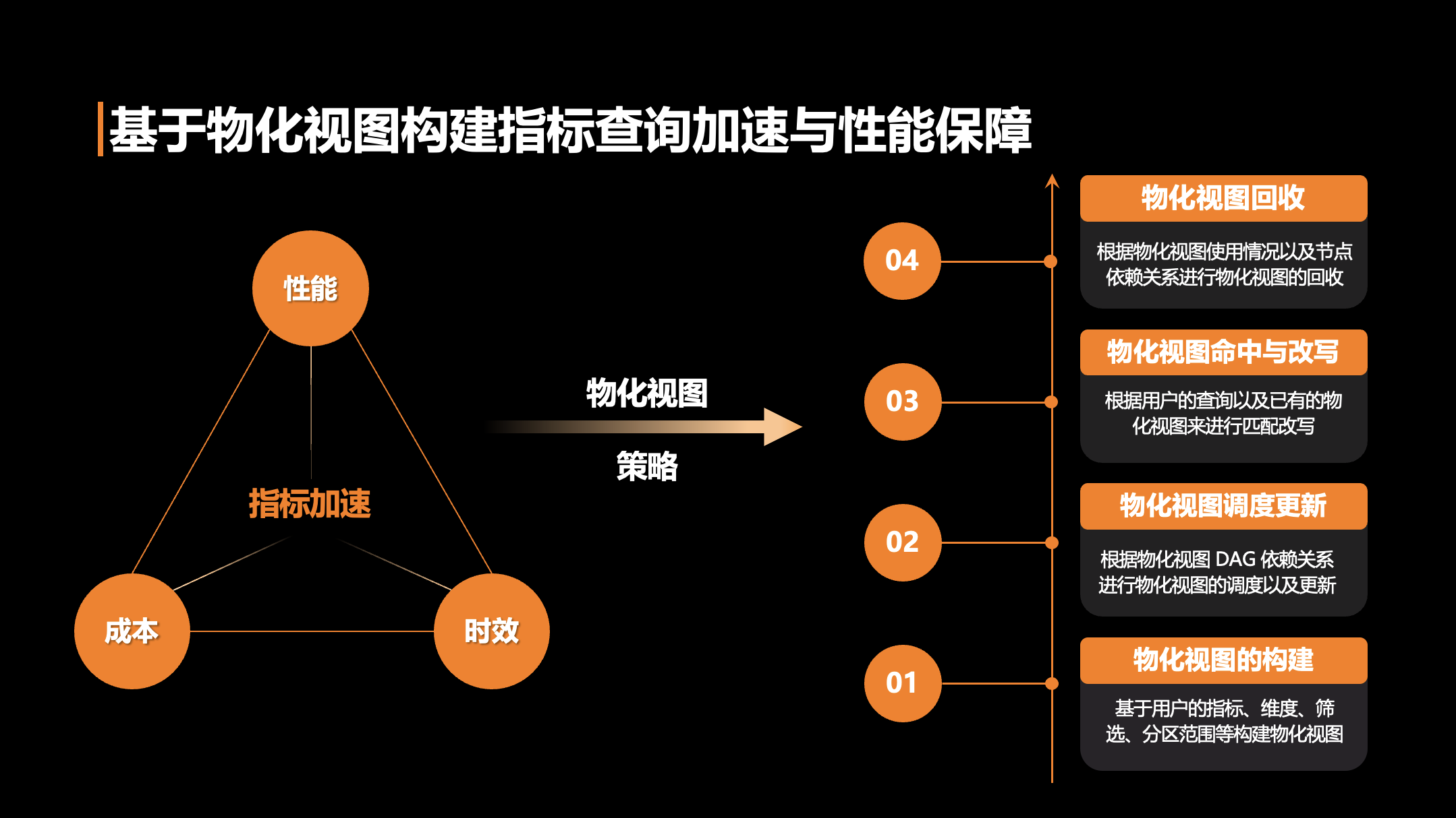 要满足这三大需求,核心有两个关键项,其一是物化视图,其二是策略。具体来说就是基于指标平台本身的物化视图构建、物化视图调度更新、物化视图命中改写以及物化视图回收。