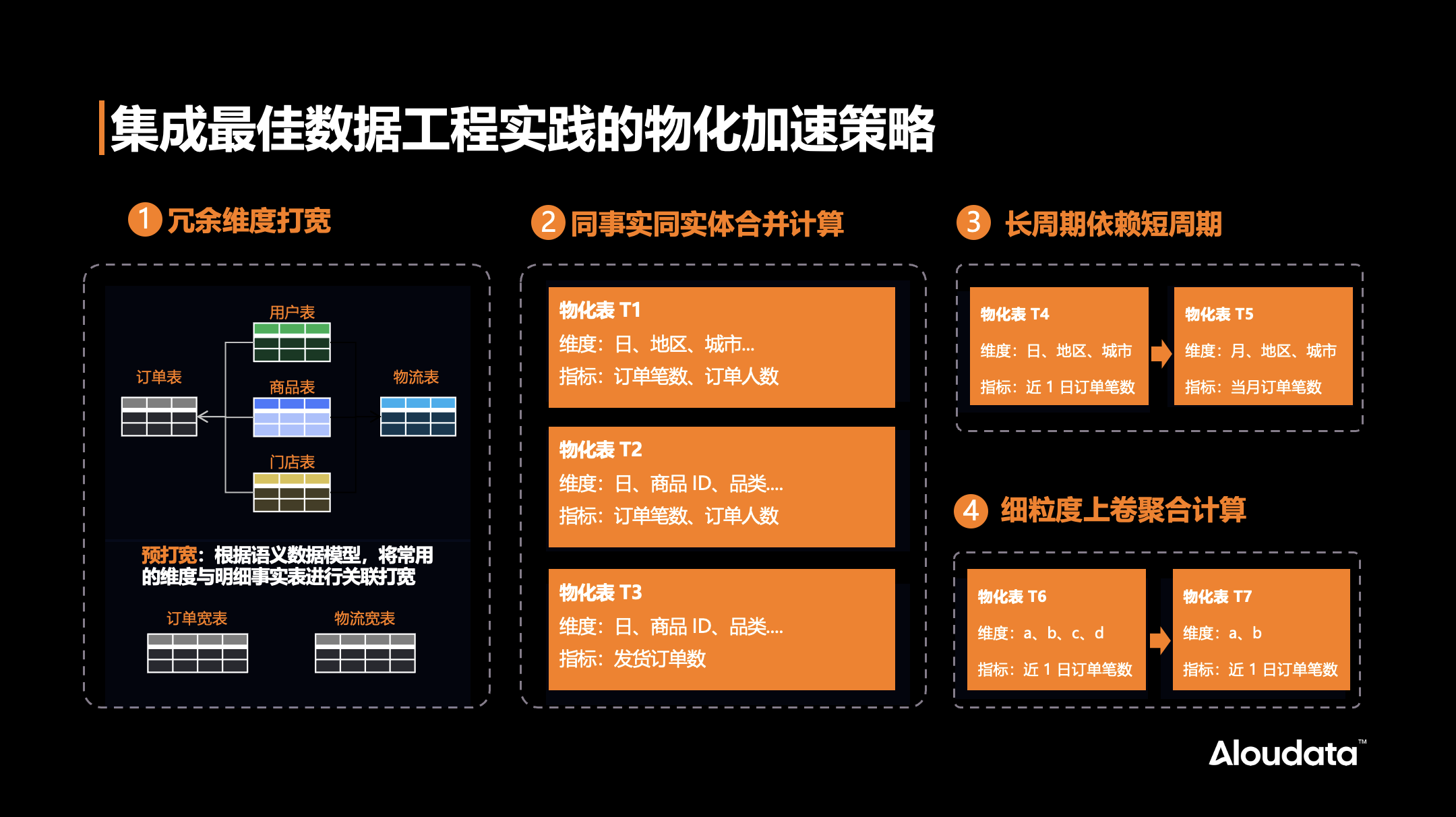 第一个是冗余维度打宽。即针对常用的维度,将其与明细事实表进行预打宽,这样上层在使用时就可以基于该明细宽表进行计算,可以减少多次关联带来的计算消耗。