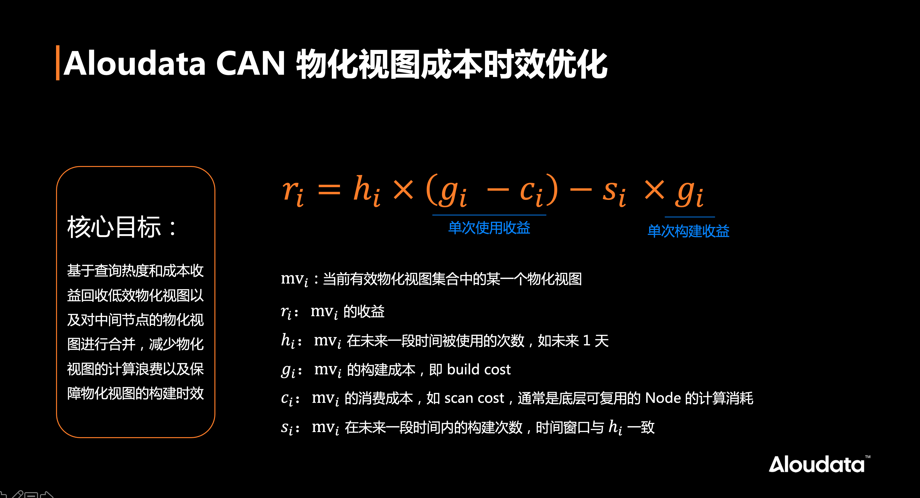 在成本效益优化方面,我们的核心目标是基于物化视图的查询热度和成本收益来减少中间的物化视图。在建立每一个物化视图时,我们会评估它带来的收益大小。上诉这个公式的核心是讲述如何平衡物化视图的成本和效益。