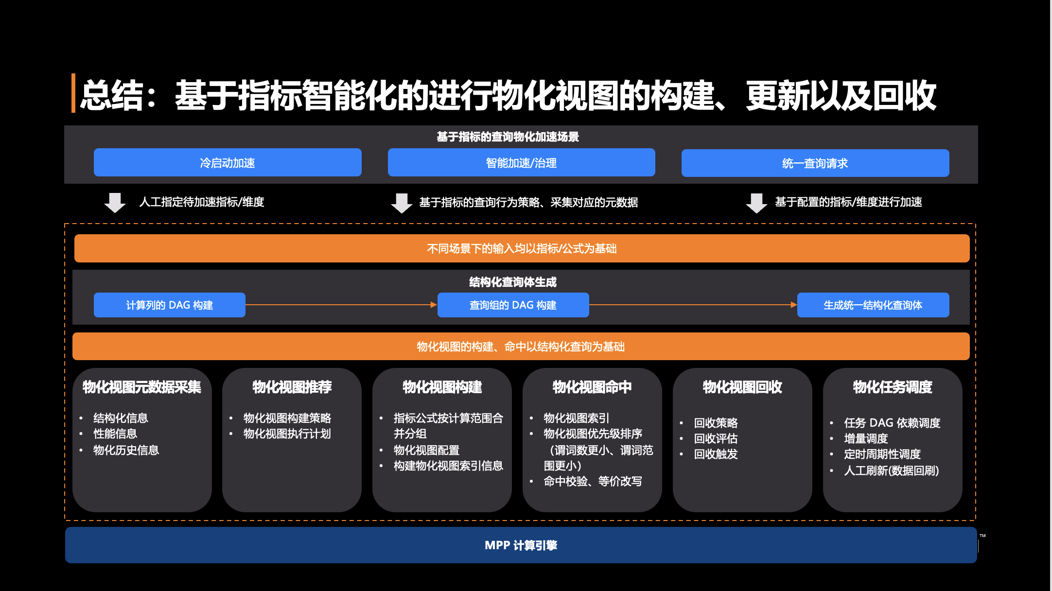 最顶层是针对对性能要求非常高的场景,如指标看板类需求,可以通过结果集的物化视图来保障。例如,计算某分行月末存款余额或者贷款余额等等。