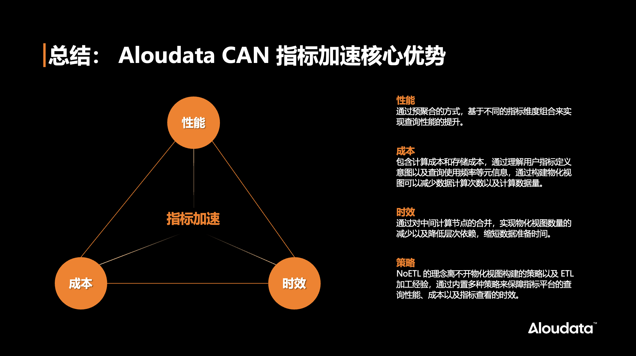 从前面的讲解我们可以看到,Aloudata CAN 在指标加速方面有四大核心优势:性能、成本、时效以及整个过程中的策略。这些策略围绕 NoETL 理念,考虑物化视图的构建、命中、回收以及成本时效,相当于有一个智能大脑在不断的迭代优化系统中产生的物化视图以及其使用情况,动态平衡性能、成本和时效。