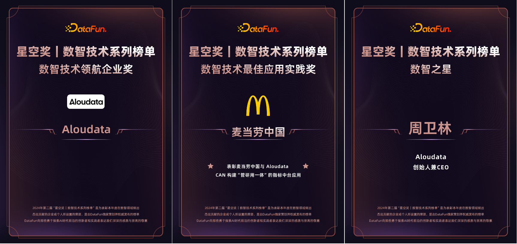 Aloudata 凭借技术领先性、产品创新性和突出的应用价值,荣获“数智技术领航企业奖”,并携手优秀客户麦当劳中国荣获“数智技术最佳应用实践奖”;Aloudata 创始人&CEO 周卫林先生获评“数智之星”。