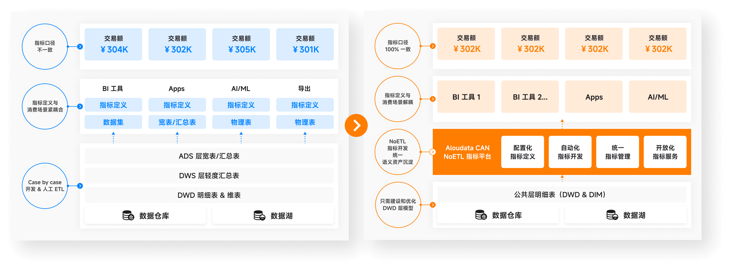 Aloudata CAN 具备强大的语义化指标定义能力和自动化 ETL 能力,NoSQL 定义指标,自动化代持宽表开发, 解耦指标定义与消费场景,实现指标跨场景的口径统一与共享复用。