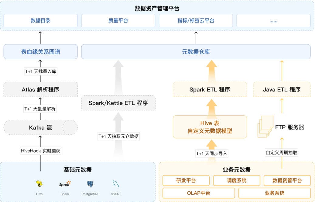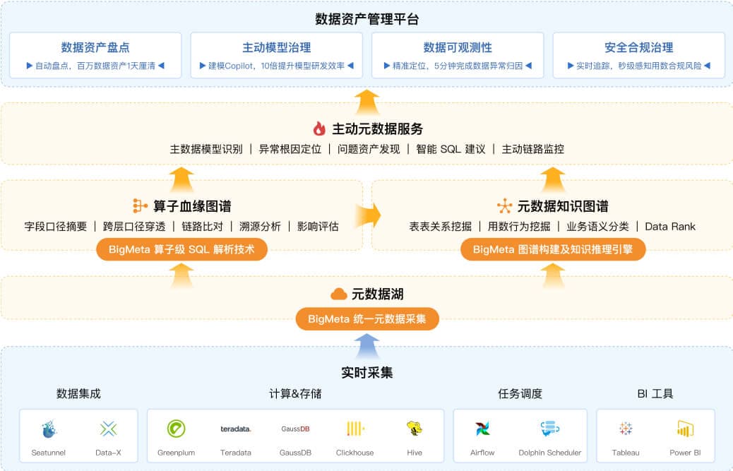 如上图所示,Aloudata 结合客户真实环境,基于 Aloudata BIG 为其设计了一套“数据资产管理平台·元数据基础能力升级”解决方案,实现了以下关键能力升级: