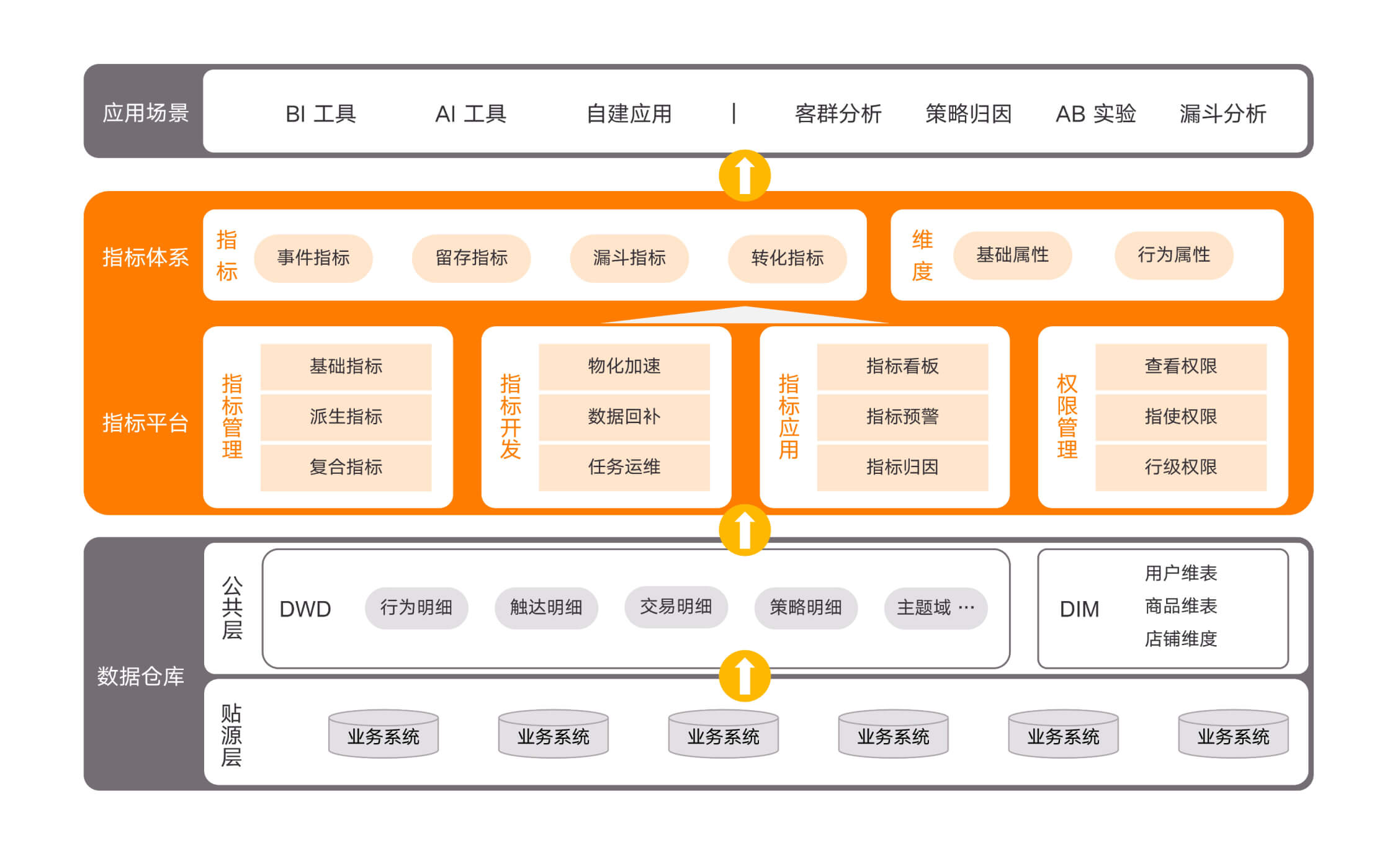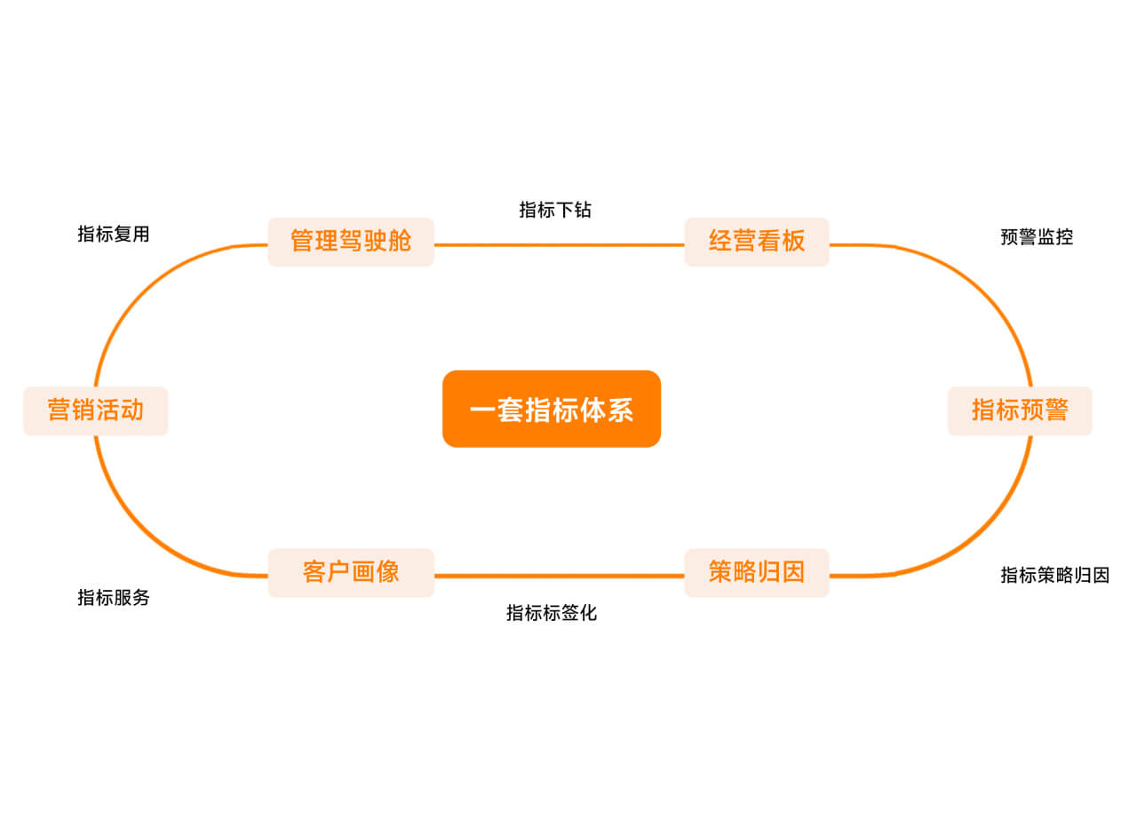 统一指标服务,支持经营分析、人群圈选、客群分析、策略归因、漏斗分析等数字化管理和数据化运营全场景,实现自上而下、全场景指标口径 100% 一致。